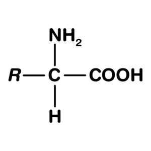 Los aminoácidos son compuestos orgánicos. En términos químicos, son un grupo de moléculas orgánicas que contienen un grupo amino (―NH2), un grupo carboxilo (―COOH) y un grupo R orgánico (o cadena lateral), que es único en cada aminoácido. El término aminoácido es una forma abreviada de “ácido α-amino carboxílico”. Cada molécula tiene un átomo de carbono central (C) al que se unen tanto el grupo amino como el grupo carboxilo. Los otros dos enlaces de ese átomo de carbono se completan generalmente con un átomo de hidrógeno (H) y el grupo R. La fórmula química se ve así: