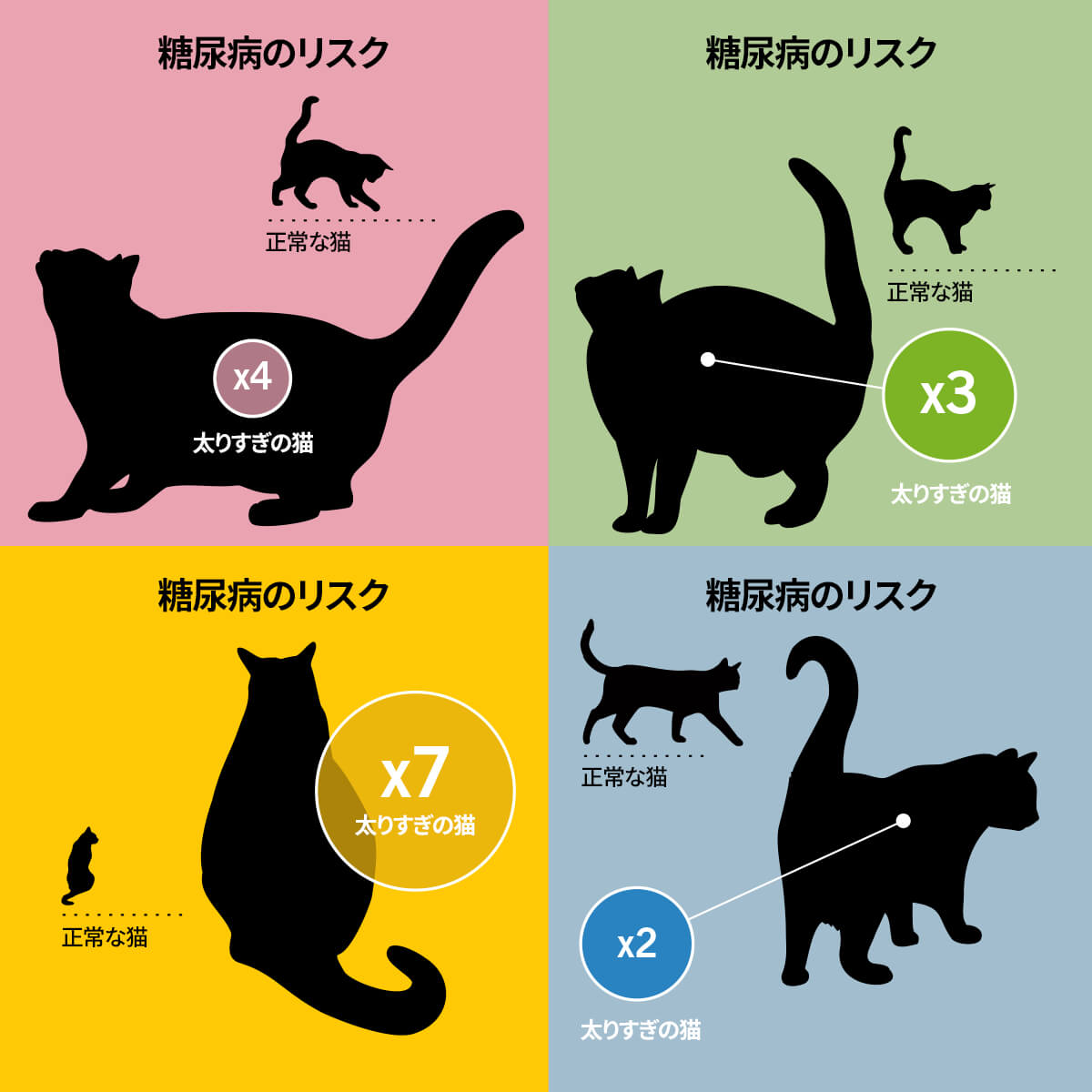 01. 「重い」または「肥満」と分類された猫は、理想体重の猫と比べて糖尿病を発症する確率が4.5倍高いことが分かりました。