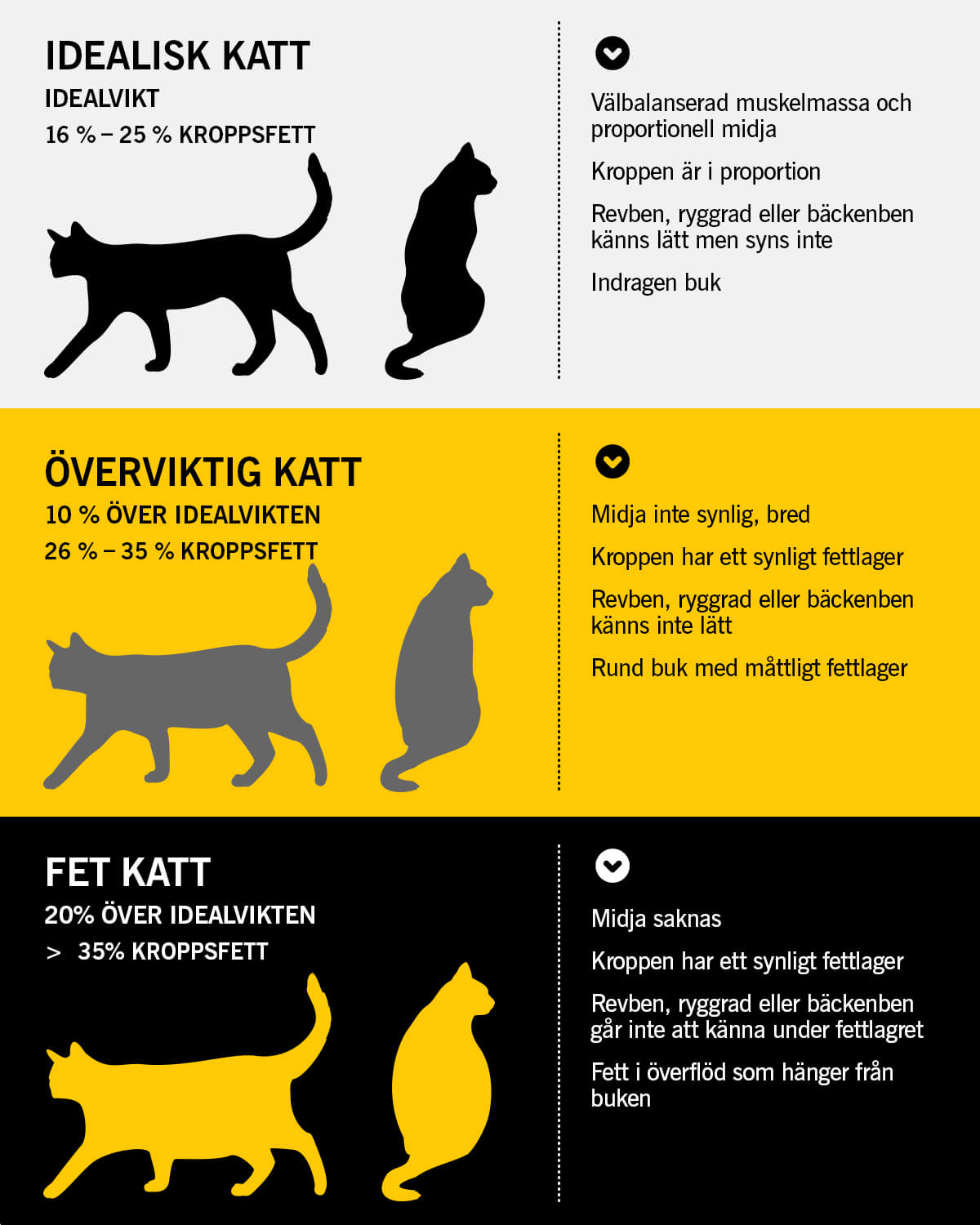Hur vet du då om din katt är fet? Den allmänna regeln är att när kattens kroppsvikt är 20 procent eller mer över den normala vikten klassas den som fet.